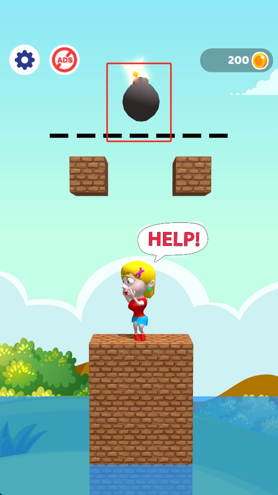 1、观察炸弹位置与虚线,点击移除虚线让炸弹掉落,避开女孩上方,利用砖块阻挡,使炸弹不威胁女孩的安全。