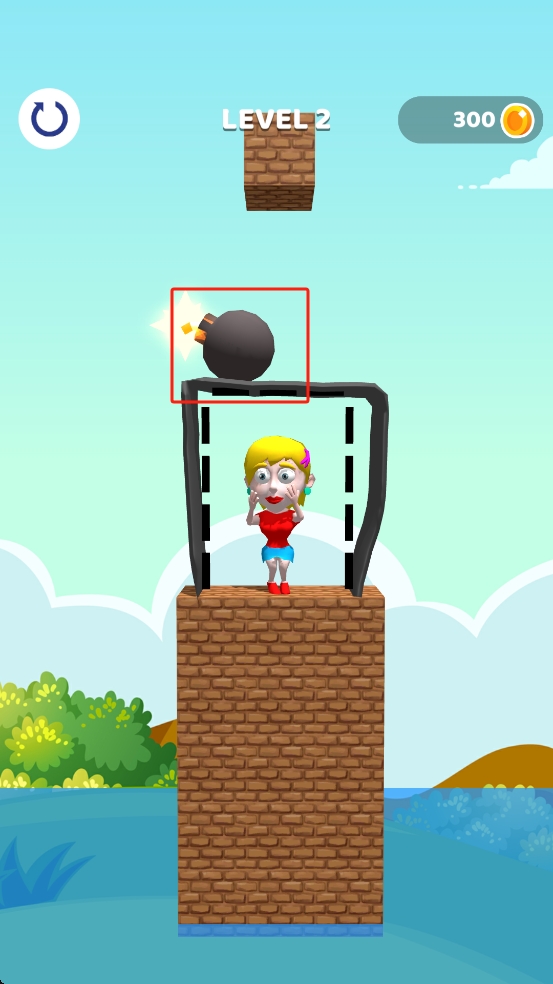 2、看炸弹和框架结构,移除障碍虚线,引导炸弹远离女孩所在框架,保护女孩同时注意金币数量。