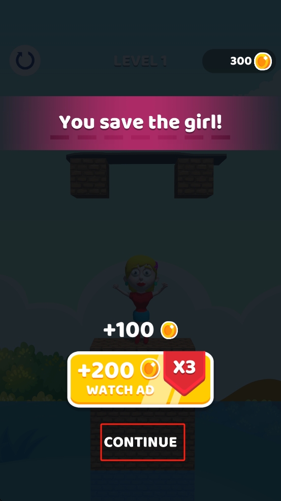 3、成功救女孩后,界面显示获100金币,我们可以点CONTINUE进下一关,或看广告来翻倍金币。