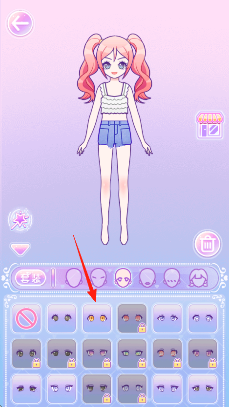 3、依次操作选眼睛→换发型→挑裙子,自由搭配,通过不同分类眼睛、发型、服装,组合多样造型,完成个性化装扮。