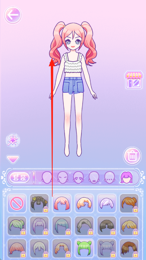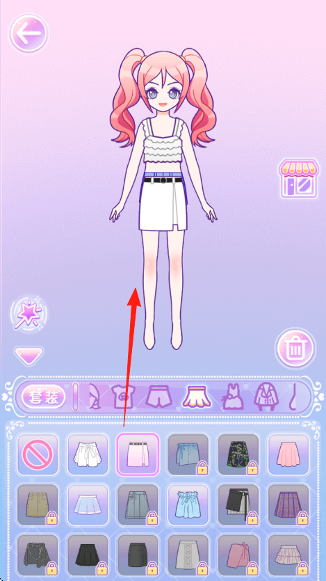 2、切换发型分类,点新发型如粉色双马尾,替换原发型,再点服装栏,选新裙子,更换穿搭,打造风格。