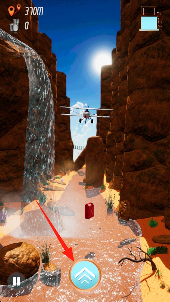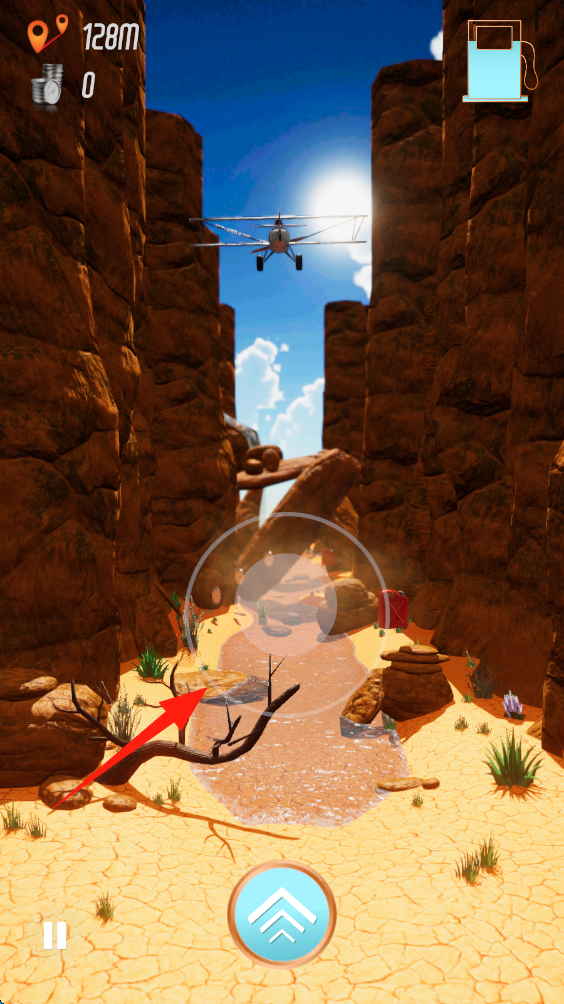 2、操控飞机在峡谷间飞行,避开树枝等障碍物,沿河道路线前进,拨动轮盘移动飞机。