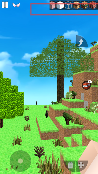 2、在游戏场景中,利用上方工具栏方块、道具等,在绿色草地、树木环境里,自由建造、探索,左侧摇杆控制移动。