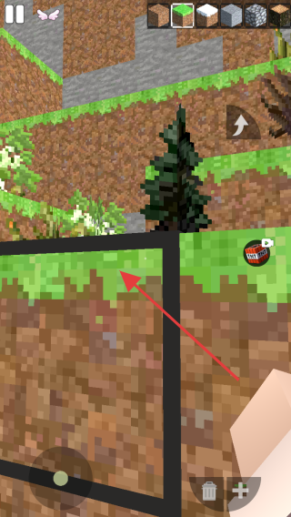 3、建造时,选择方块如草地方块,点击箭头指向的地面区域,放置方块,搭建建筑,打造专属像素乐园。