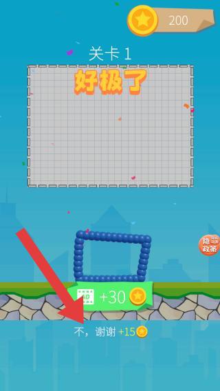 2、将绘制的线条能够精准的击中小狗,才算关卡挑战成功,显示已通过,奖励金币+15,领取后自动进入到下一关。