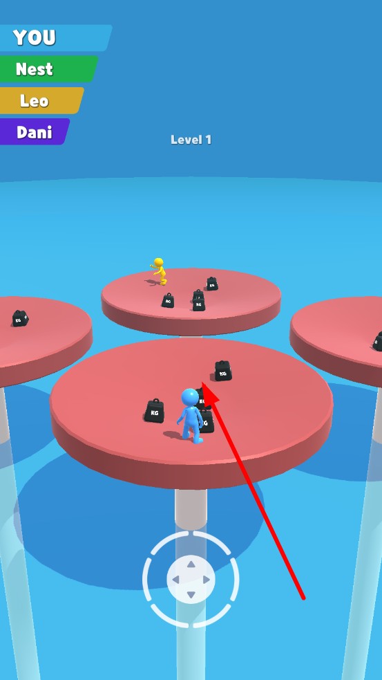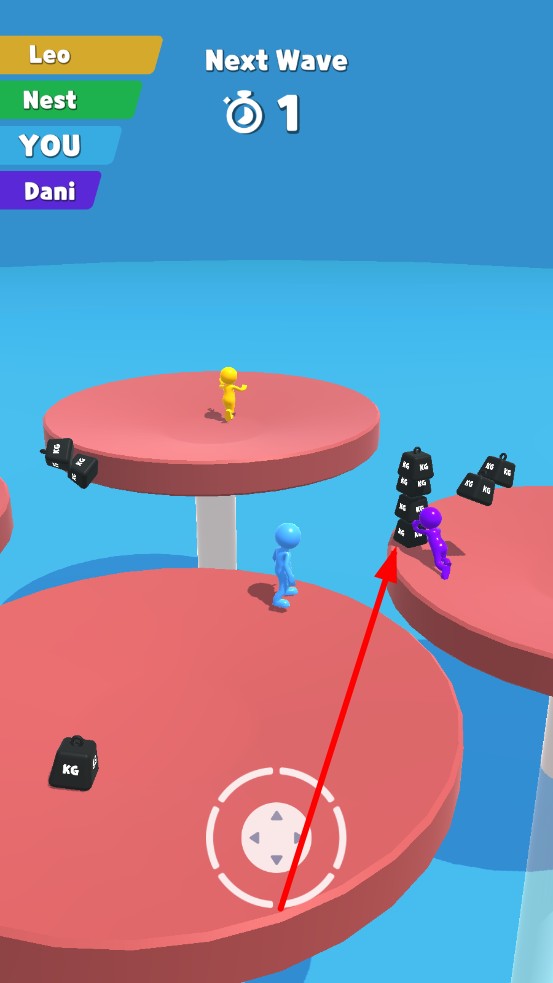 1、进入游戏选择橡皮人外观,在圆形竞技台通过虚拟摇杆操控移动,靠近黑色重物时,自动拾取,需规划移动路线,警惕对手干扰,避免自身掉落平台。