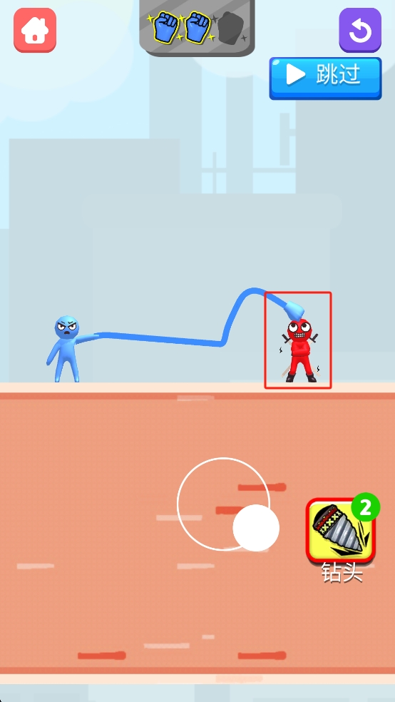 2、拖动蓝色角色手臂,让其精准延伸击中红色敌人,利用手臂攻击机制,确保命中造成伤害,快速击败对手。
