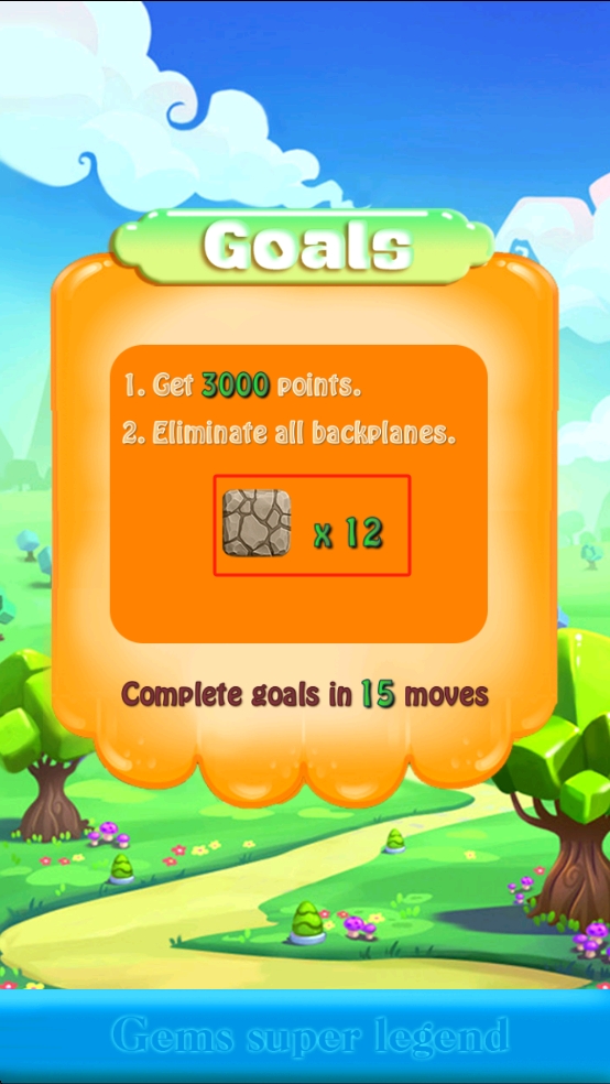 1、本关目标为15步内获取3000分并消除12块石板,需规划消除策略,优先组合石板旁同色宝石,借连消清理石板获取高分。