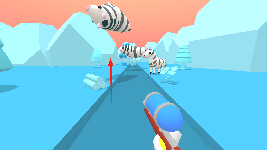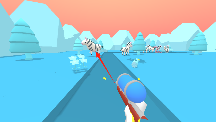 3、顺着箭头方向,瞄准空中飞起的斑马,快速射击命中,持续清除道路上及空中的斑马障碍,保持射击节奏推进。
