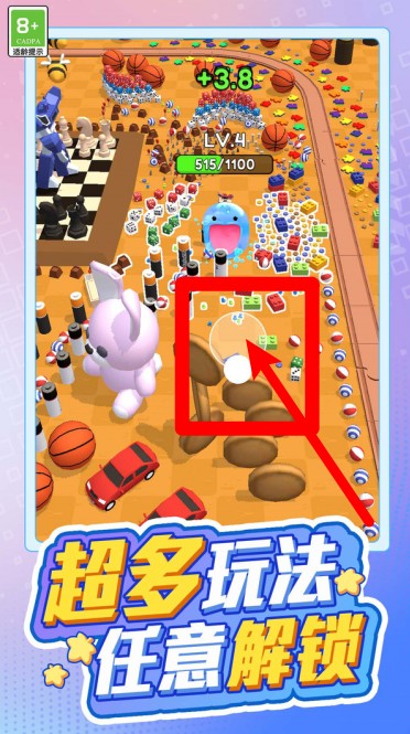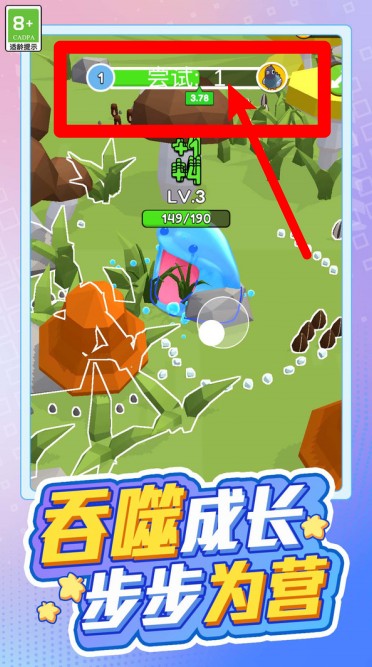 3.果冻角色位于充满道具与障碍的地图中,通过虚拟摇杆灵活操控移动,收集物品并持续提升角色体型与等级。