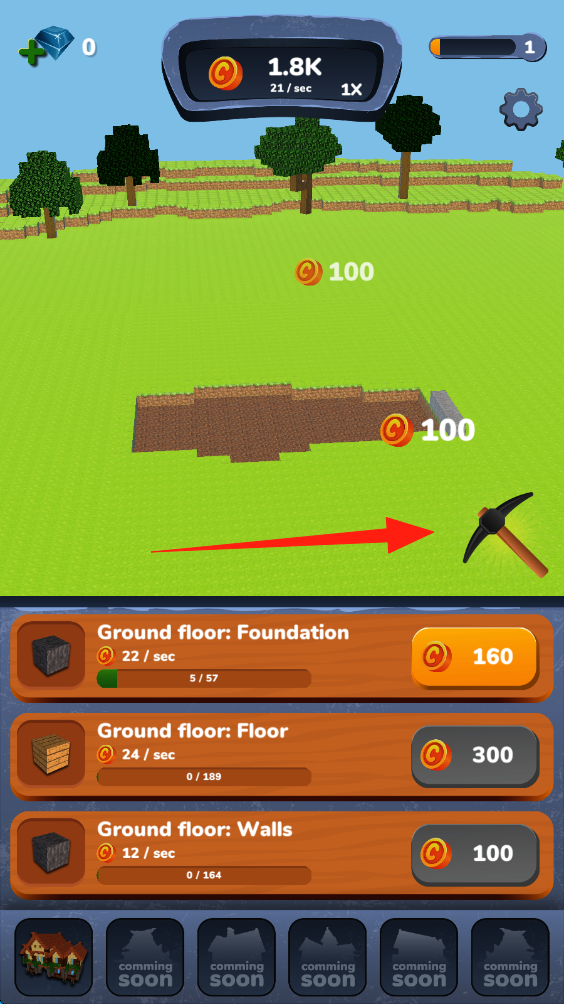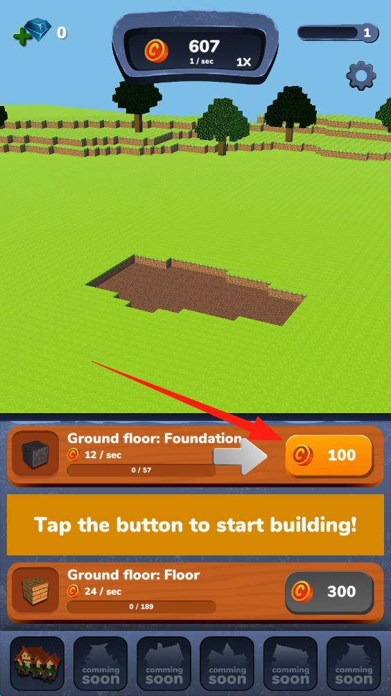 1、点击100金币按钮,消耗金币建造Ground-floor-Foundation,推进房屋建造第一步。