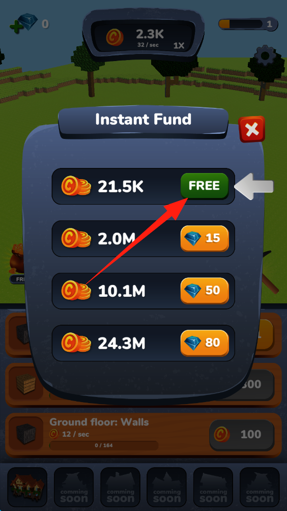 3、在Instant-Fund界面,点击FREE按钮,免费获取21.5K金币,用于后续建筑升级。