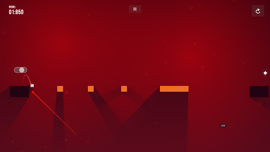 1、通过单指滑动或点击屏幕控制角色跳跃与移动,跨越橙色方块、深色平台等障碍,在限时内抵达终点。