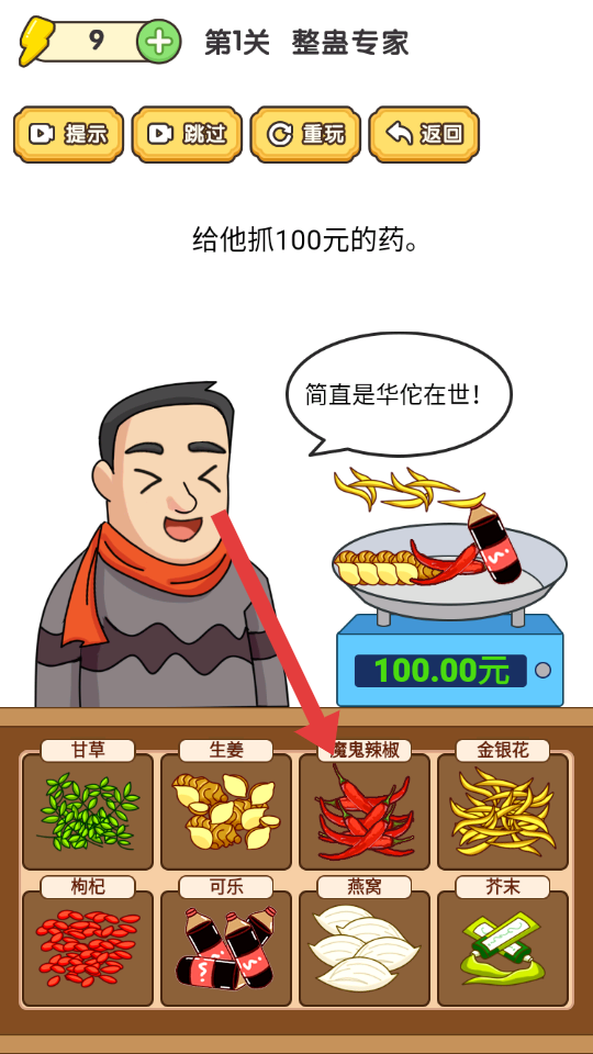 1、第1关整蛊专家,目标抓100元药,观察下方食材,选可乐,魔鬼辣椒等恶搞物品,凑够100元。