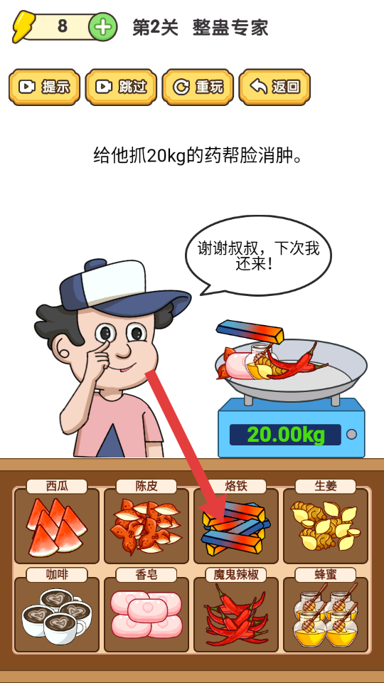 2、第2关,需抓20kg药消肿,找烙铁这类奇葩物品,拖进秤盘,达到20kg重量,触发整蛊效果。