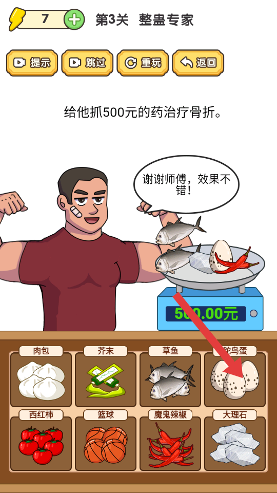 3、第3关,治疗骨折抓500元药,选大理石,鸵鸟蛋等怪异物品,拖入秤盘凑500元,完成整蛊。