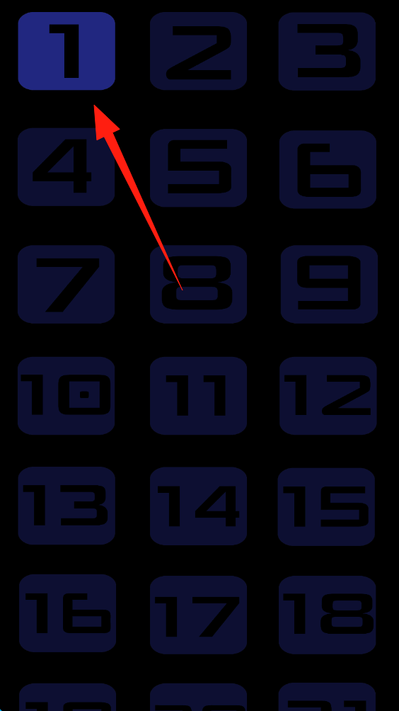2、在关卡选择界面,点击数字1按钮,进入第一关,开启音波球的冒险旅程,点击选择关卡。