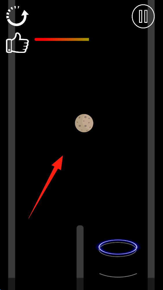 3、游戏中操控球体,利用蓝色光环弹射,避开障碍物,让球体持续向上移动得分,拨动轮盘移动小球。
