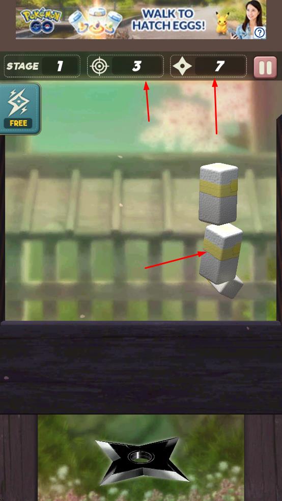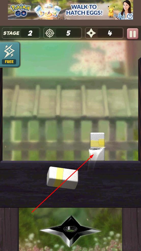 1、点击底部黑色手里剑,瞄准上方方块投掷,破坏障碍。