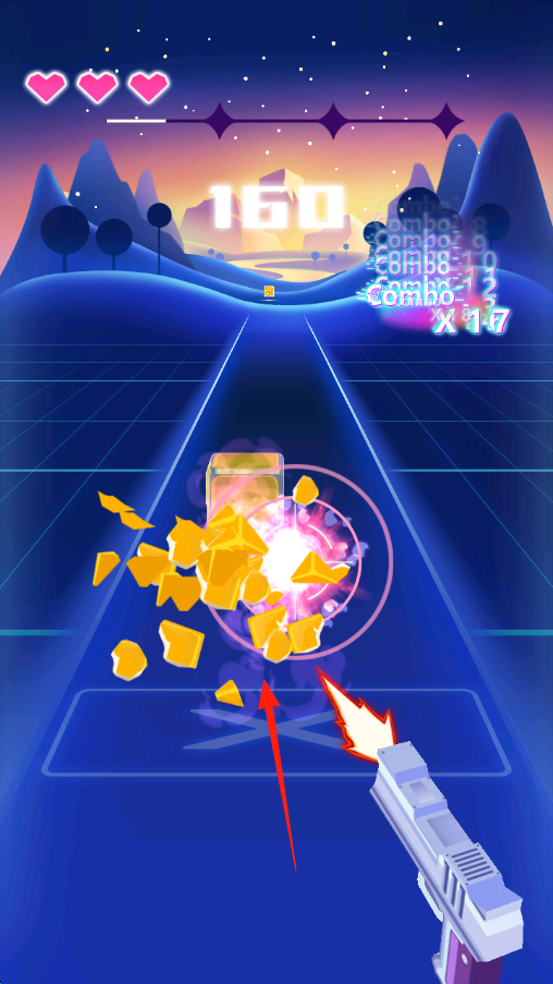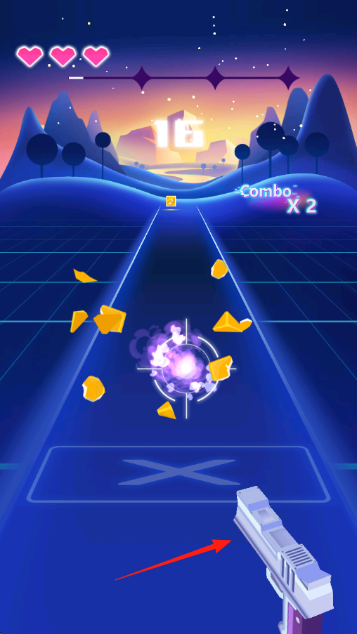 1、进入游戏后,跟随音乐节奏,用下方枪支红箭头指向瞄准轨道上的金色方块、道具射击。