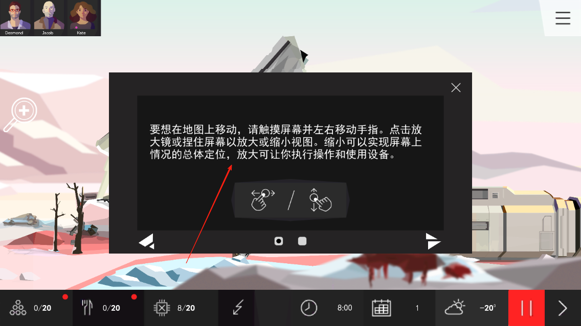 1、按指引触摸屏幕左右滑动,移动地图视图,点击放大镜或捏合屏幕缩放,定位场景、执行操作,探索飞船残骸区域。