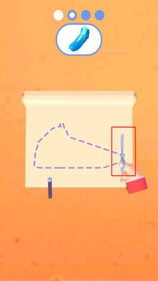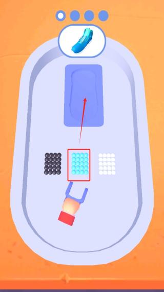 1、进入作品后,我们用夹子夹取中间浅蓝色小球,放置到上方鞋模区域,按箭头指引填充,为鞋子制作准备材料。