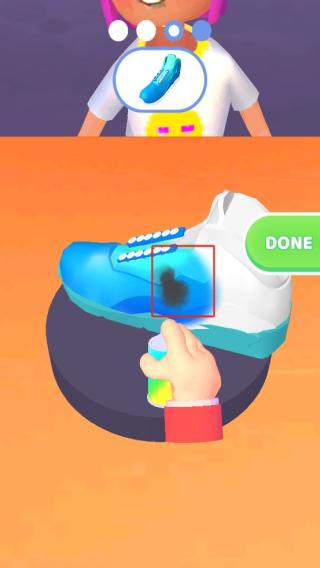 3、针对鞋子上的黑色污渍,用喷雾罐对准喷涂,上完色后点击DONE按钮,完成鞋子的定制,进入下一个流程。