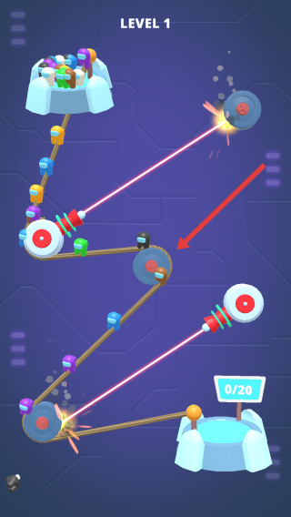 2、滑动屏幕,绘制绳索连接上下装置,引导小球沿绳索移动,尝试将20个小球运到下方,推进关卡。