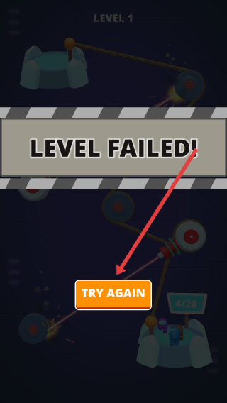 3、若关卡失败如运输不足,点击橙色TRY-AGAIN按钮,重新规划绳索,挑战Level1,完成运输任务。