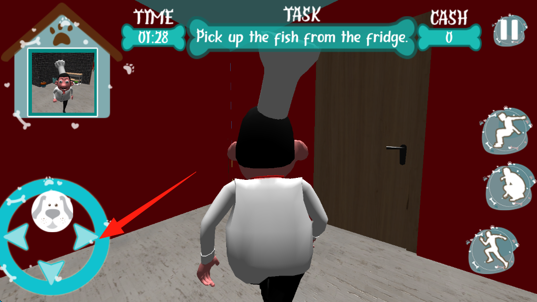 3、操控左侧虚拟摇杆移动厨师角色,前往冰箱取鱼,完成Pick-up-the-fish-from-the-fridge任务。