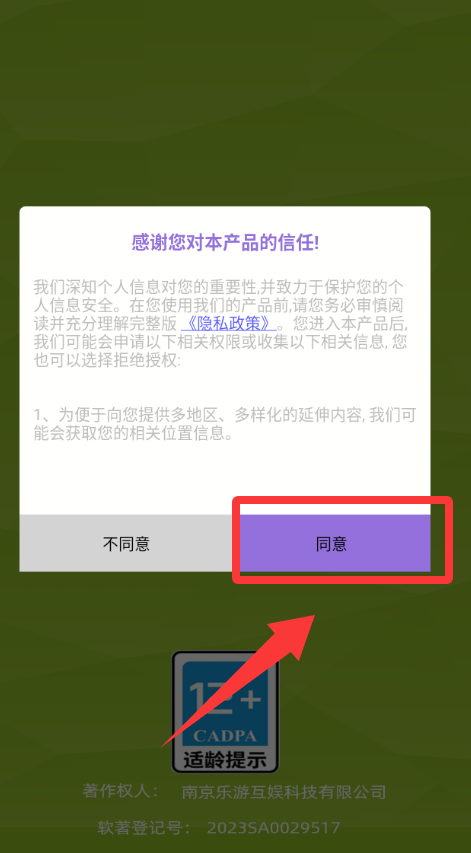 1、点击红色框框里的同意并进入游戏。