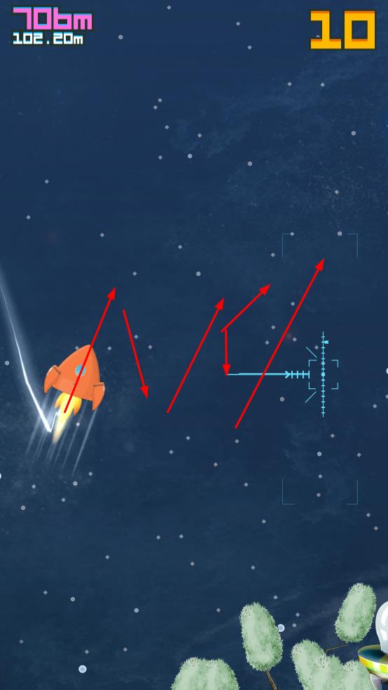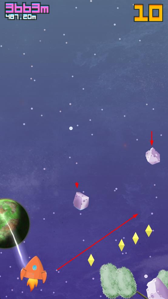 3、留意紫色陨石等障碍物,及时调整飞行路线,避免碰撞,保障火箭持续飞行。