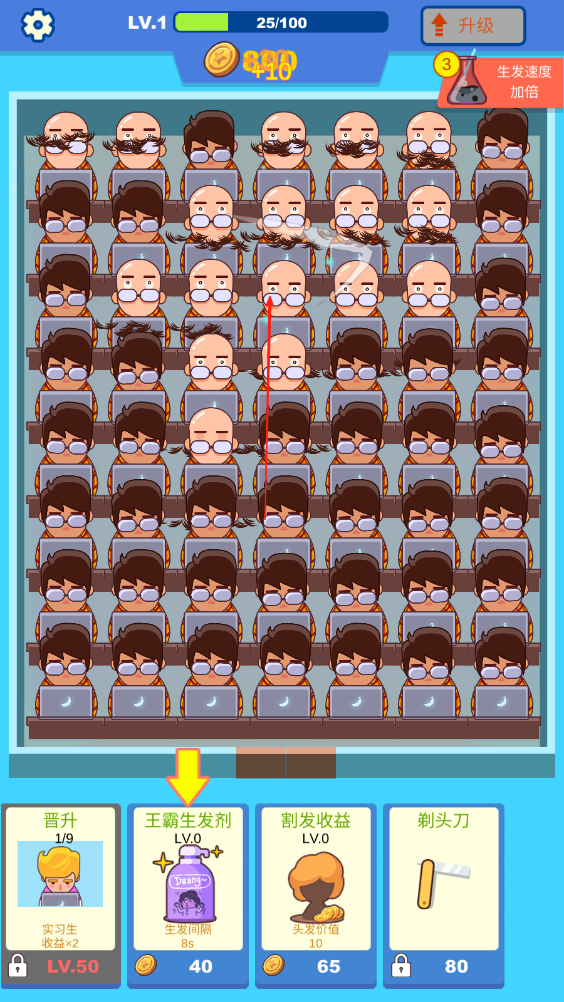1、滑动屏幕点击头顶头发的程序员们,收割他们的头发资源,积累金币,用于升级下方功能。