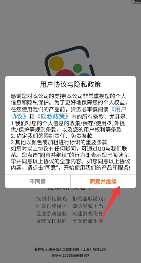1、点击用户协议与隐私政策里的同意并继续。