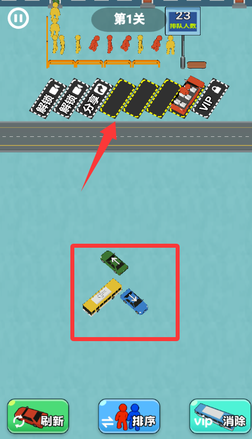 3、点击红色框框的车过去装对应颜色的客人。