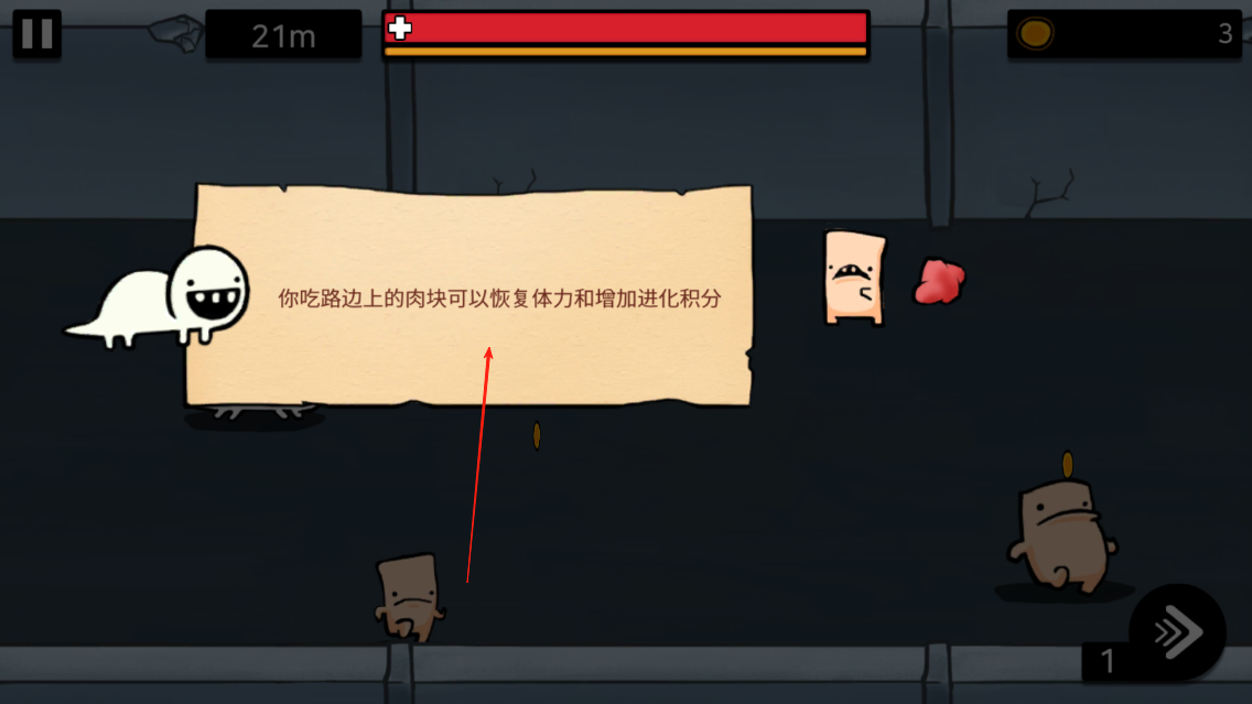 2、按提示吃路边肉块,恢复体力同时积累进化积分,助力鬼魂成长、进化,持续吞噬障碍物和敌人获取肉类。