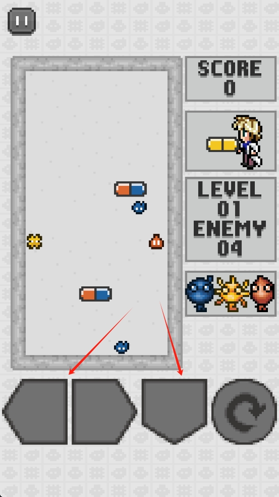 2、进入实际关卡,依据下方箭头、盾牌等按键,操控蓝色小生物移动,收集场景中胶囊,同时避开或击败右侧显示的敌人。