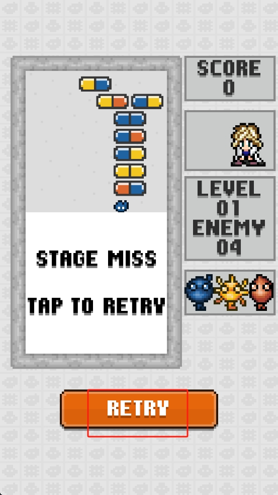 3、若出现STAGE MISS失败提示,点击下方橙色RETRY按钮,重新挑战本关卡,调整策略,争取通关。
