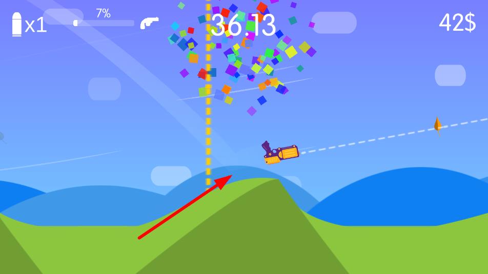 2、飞行过程中观察重力与风阻影响,通过再次点击触发武器特性,调整轨迹以避开障碍飞得更远。