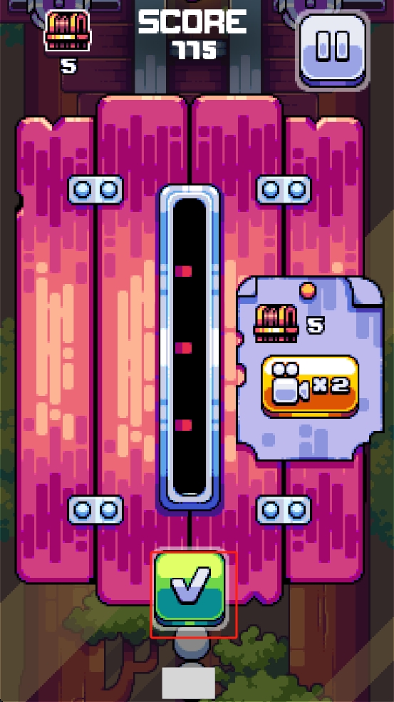 3、到达粉色关卡区域,当进度条推进完成,点击下方绿色对勾按钮,确认通过本关卡,同时解锁新的挑战。