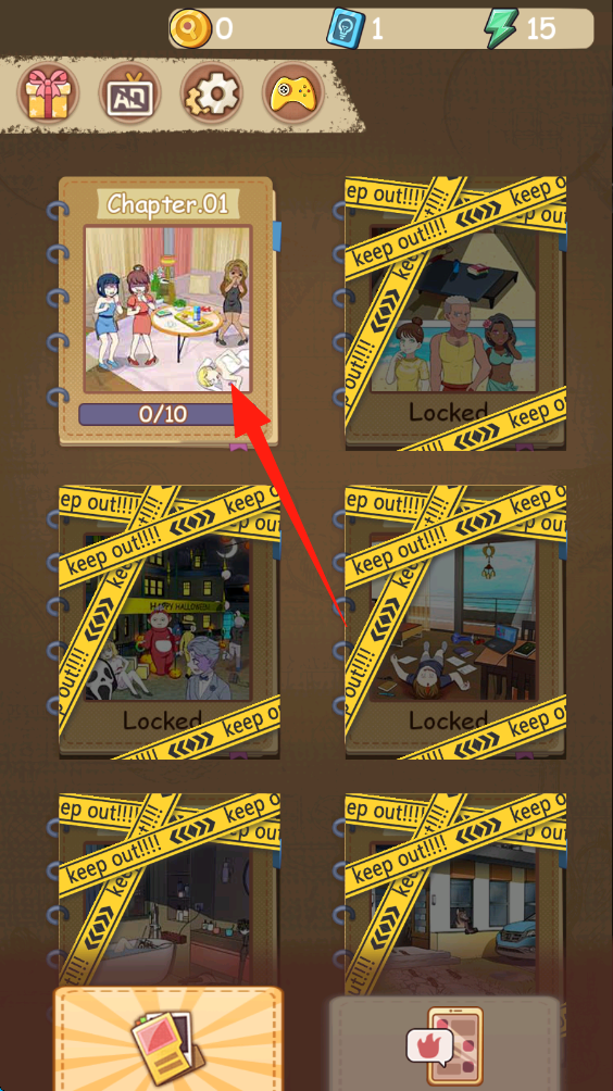 1、点击Chapter.01章节卡片,进入该章节的案件挑战,需完成10个任务目标解锁后续。