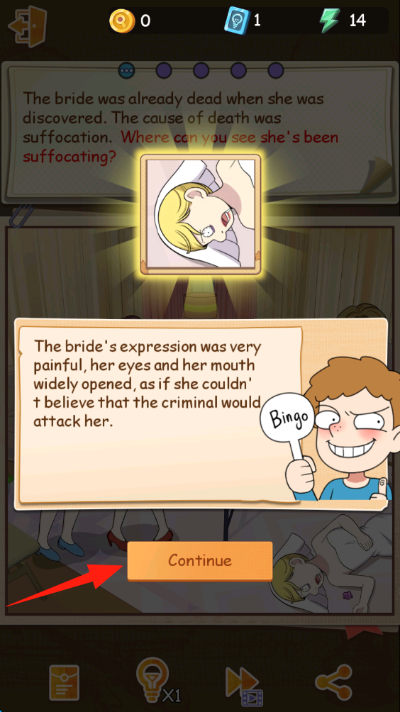 2、在案件剧情界面,阅读新娘死亡相关描述后,点击Continue按钮,推进案件调查流程。