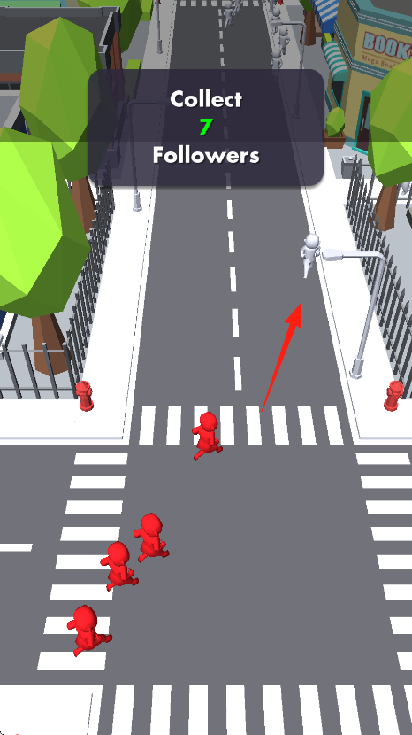 3、按照下图所示,收集到一定数量火柴人的时候,可以去箭头指示方向的房子里面收集队伍人数。