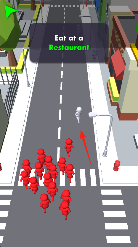 2、城市穿梭与餐馆突袭:在城市中奔跑,寻找并吞噬其他小人群,同时前往餐馆进行突袭,招募更多人员加入自己的队伍,通过消费和饮食提升人群皮肤等级。