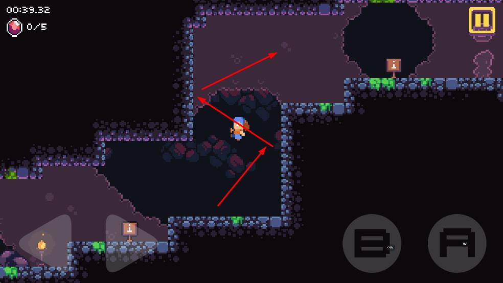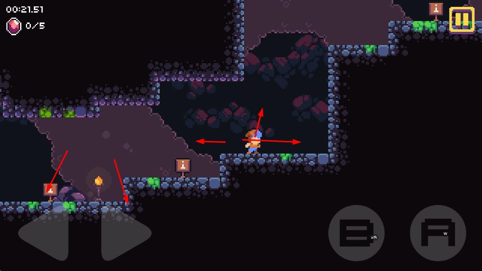 1、操控左下角虚拟按键,控制角色上下左右移动,探索洞穴场景,留意路标指引与地形变化。