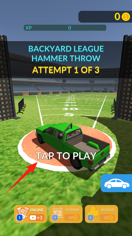 1、点击TAP-TO-PLAY,开始BACKYARD-LEAGUE的hammer-throw挑战,进入第一回合投掷。