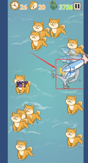 3、操控红框背鱼角色,避开柴犬收集3756金币。