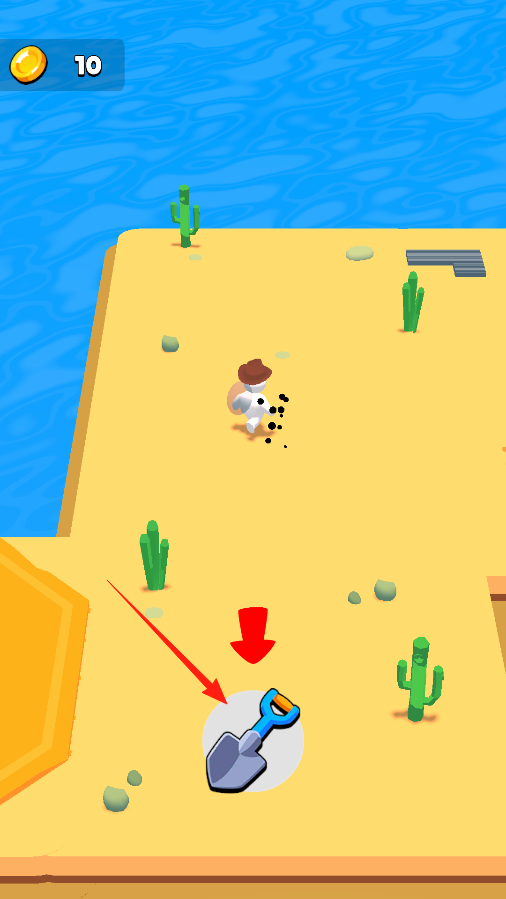 2、角色在沙地上移动,看到地上有一把铲子,走近铲子,捡起它,这样就可以用铲子在沙地上挖掘,说不定能挖到宝藏或者其他有用的东西。