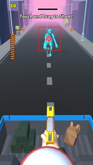 1、进入作品后,路面有蓝色敌人,长按屏幕拖动瞄准,松开射击,用黄色枪支消灭敌人推进关卡。