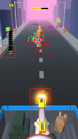 2、行进遇多个敌人,留意左侧弹药数,靠近橙色弹药堆补充,瞄准弱点射击,优先打血厚敌人,攒金币升级武器。